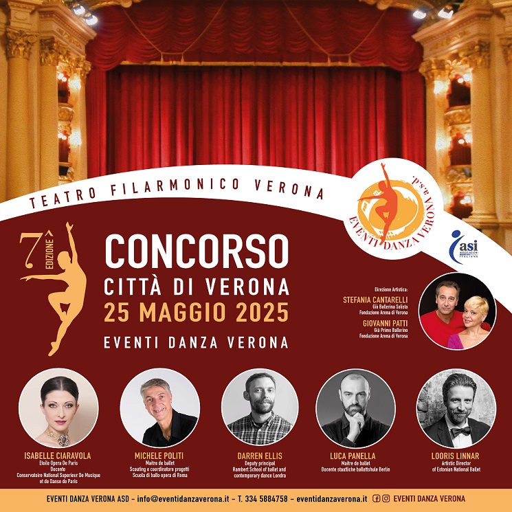 Il concorso Danza Città di Verona diretto artisticamente da Stefania Cantarelli (già Ballerina Solita della Fondazione Arena) e Giovanni Patti (già Primo Ballerino della Fondazione Arena) che da anni si dedicano con passione alla trasmissione della nobile arte di Tersicore, è giunto alla settima edizione offrendo a tanti ragazzi e ragazze innanzitutto l’opportunità di esibirsi su un palcoscenico prestigioso come quello del Teatro Filarmonico di Verona e, nel caso, di vincere borse di studio da utilizzare per periodi di studio/lavoro in Italia e all’estero, nonché far conoscere il proprio talento ai Direttori e Maître de Ballet di corpi di ballo internazionali. La data fissata per la settima edizione è il 25 maggio 2025.