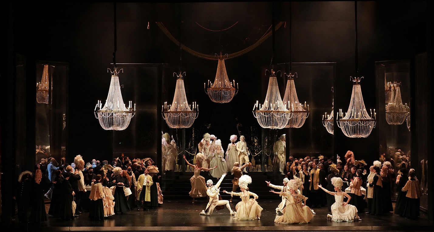 Giocato tutto sui toni del bianco e nero in spazi astratti dominati da giganteschi lampadari che sono un elemento ricorrente della resa scenografica dell’opera (alla Scala si ricorda la scena di Ezio Frigerio) in cui si muovono personaggi in costumi ricchi di riferimenti storici stratificati, lo spettacolo di Matthias Hartmann porta in palcoscenico anche un personaggio di sfondo che però gioca un ruolo fondamentale nella vicenda. È il Conte di Saint-Germain, l’uomo che secondo il racconto di Tomskij fu sedotto dalla Contessa che nei suoi anni di gioventù gli chiese un prestito in denaro ottenendone molto di più: le tre carte, il segreto per vincere al gioco di cui Hermann vuole impossessarsi. Il Conte di Saint-Germain è un personaggio storico di cui non si conoscono né le origini né il vero nome e che appare ammantato di mistero e di ingenti ricchezze in diverse corti europee, dichiarando di poter trasformare la materia e sconfiggere la morte. Dal 1748 è a Parigi, intimo di Luigi XV e della Pompadour; nel 1762 è a San Pietroburgo nel circolo degli Orlovskij e forse partecipa alla congiura che porta al trono Caterina II; è poi segnalato alla corte di Carlo d’Assia. Cagliostro si professava suo discepolo.
