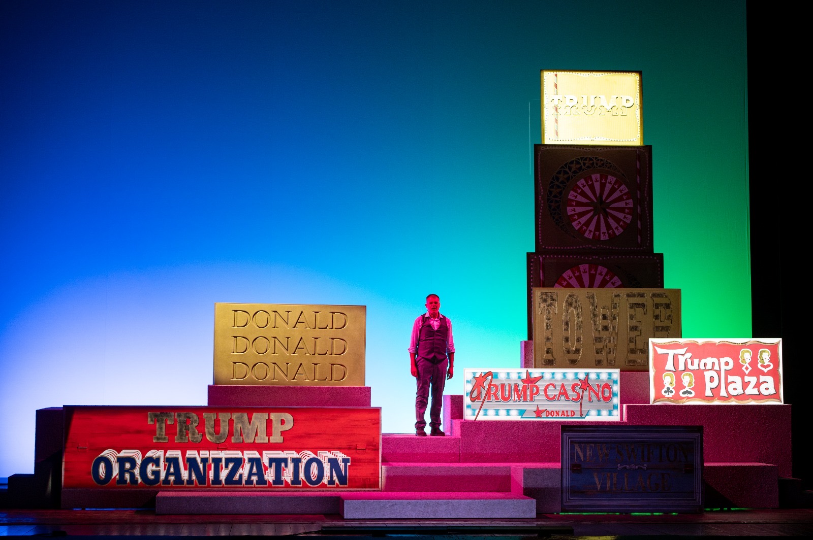 Stefano Massini dimostra di avere una buona tecnica attoriale e di saper tenere il palcoscenico in modo preciso e puntuale. L’attore è sicuro, disinvolto, convincente. I passaggi sono accurati e ben studiati. Certo il tutto manca ancora di scioltezza, ma, essendo un’anteprima, immaginiamo migliorerà con le repliche. La storia è narrata avvalendosi della bella scena di Paolo di Benedetto: una serie di cubi a diversi livelli da cui escono cartelli con le scritte delle varie imprese di Donald. Sullo sfondo si eleva ad un certo punto addirittura un grattacielo. Il tutto scompare nel finale, nel momento dell’apparente fallimento che porterà alla scelta dell’agone politico. Molte imprecisioni nelle luci, progettate da Manuel Frenda, evidentemente ancora non a fuoco nella serata mantovana.