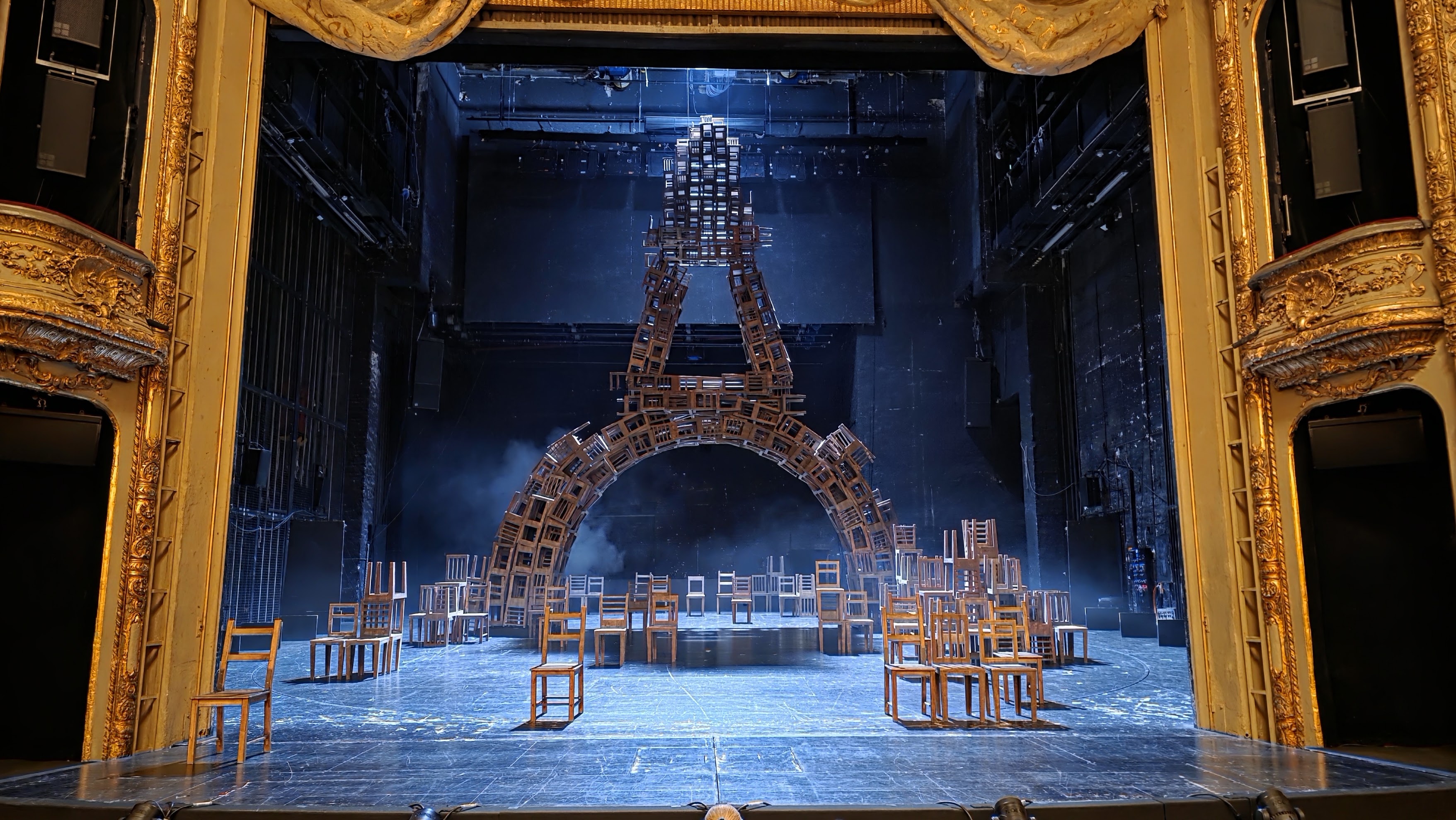 La messa in scena è sobria e rigorosa: mescola tratti teatrali e tratti di narrazione romanzesca senza preoccuparsi eccessivamente di chiarire gli snodi drammaturgici; si dipana principalmente per brevi flash e scene singole, che si affastellano nello sviluppo della narrazione. Il romanzo di Feuchtwanger è caratterizzato da un lento declino verso l'abisso, che si esplicita nella bella scenografia ideata da Annette Kurz. Sobri e appropriati i costumi di Ilse Vandenbussche. Inizialmente, quando sembra esserci ancora una qualche speranza di libertà, la scena si apre su una immensa Torre Eiffel, di grande impatto scenico, riprodotta però con mobili e sedie. Questa stessa Torre viene via via smantellata, proprio come le speranze di libertà dei personaggi, tanto che alla fine dello spettacolo non rimane che un palco scabro e vuoto. Un teatro scorticato, privo di quinte, privo di quadratura, privo di qualsiasi protezione che l'arte può fornire alla vita. Come se la barbarie nazista avesse tolto ai personaggi, e in fondo anche al pubblico, ogni speranza e ogni possibilità di riscatto. L’iniziale costruzione con le sedie è perciò una mera illusione: nulla può salvare dalla barbarie: né l’arte, né il teatro.