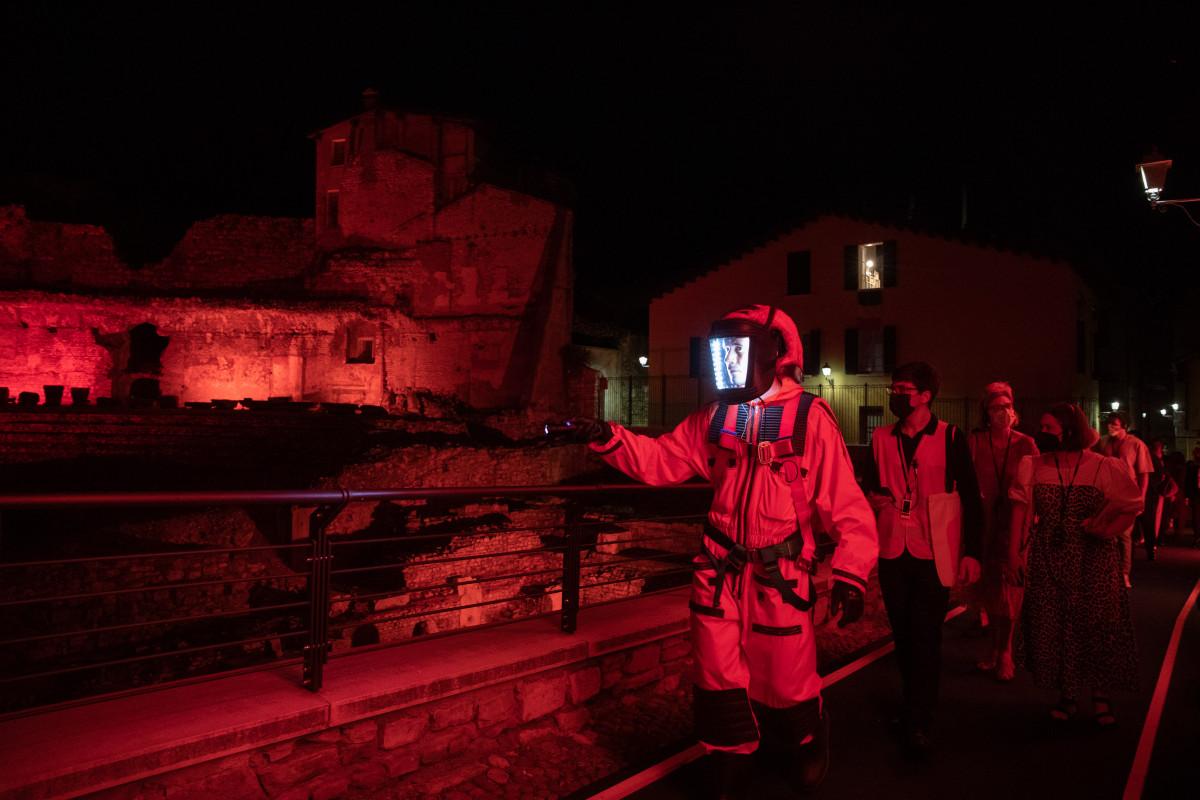 Un insolito cicerone guida gli spettatori lungo il tragitto, scortandoli attraverso scenari fantastici, epigrafi e rovine conservate nel parco monumentale. Un viaggio nel tempo emozionante nel cuore di uno dei luoghi fondamentali della storia della nostra città. Ideato e diretto da Fausto Cabra, attore e regista bresciano impegnato con successo sulla scena nazionale ed europea, lo spettacolo è scritto da Marco Archetti in collaborazione con Silvia Quarantini e vede l’interpretazione di Anna Gualdo, Alfonso De Vreese, Alberto Onofrietti, Pablo Ezequiel Rizzo, Filippo Porro e Isacco Venturini. Le scene sono di Rossella Zucchi, le luci di Cesare Agoni, la drammaturgia del suono e le musiche originali di Mimosa Campironi, Bruna Calvaresi ha lavorato alla ricerca ed elaborazione costumi, Anna Leopaldo è assistente alla regia.