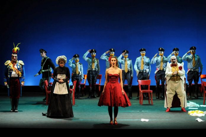 Una girandola mirabolante che permea lo spazio nudo di colori sgargianti, di maschere – straordinaria la gag dei poliziotti-paperini, armati di pistole ad acqua, in chiusura di primo atto - e che finisce per insinuarsi anche sotto la pelle dei personaggi. Bartolo-Balanzone con faccia da bulldog, Basilio-rettile, così che la celeberrima aria della calunnia si fa plastica evidenza, Berta che sotto il grembiule di serva rivela un’ardita mise in rosso sgargiante. E Figaro, un Arlecchino postmoderno e surreale, con acconciatura che ne sottolinea le orecchie da volpe. Di fronte ad un pubblico numeroso (l’occasione avrebbe meritato il sold out), lo scorso 23 dicembre, Il barbiere di Siviglia approdava al Sociale come una carovana festosa sulla scena divenuta stazione ferroviaria, con la voce che dall’altoparlante annunciava il treno in partenza per Siviglia.