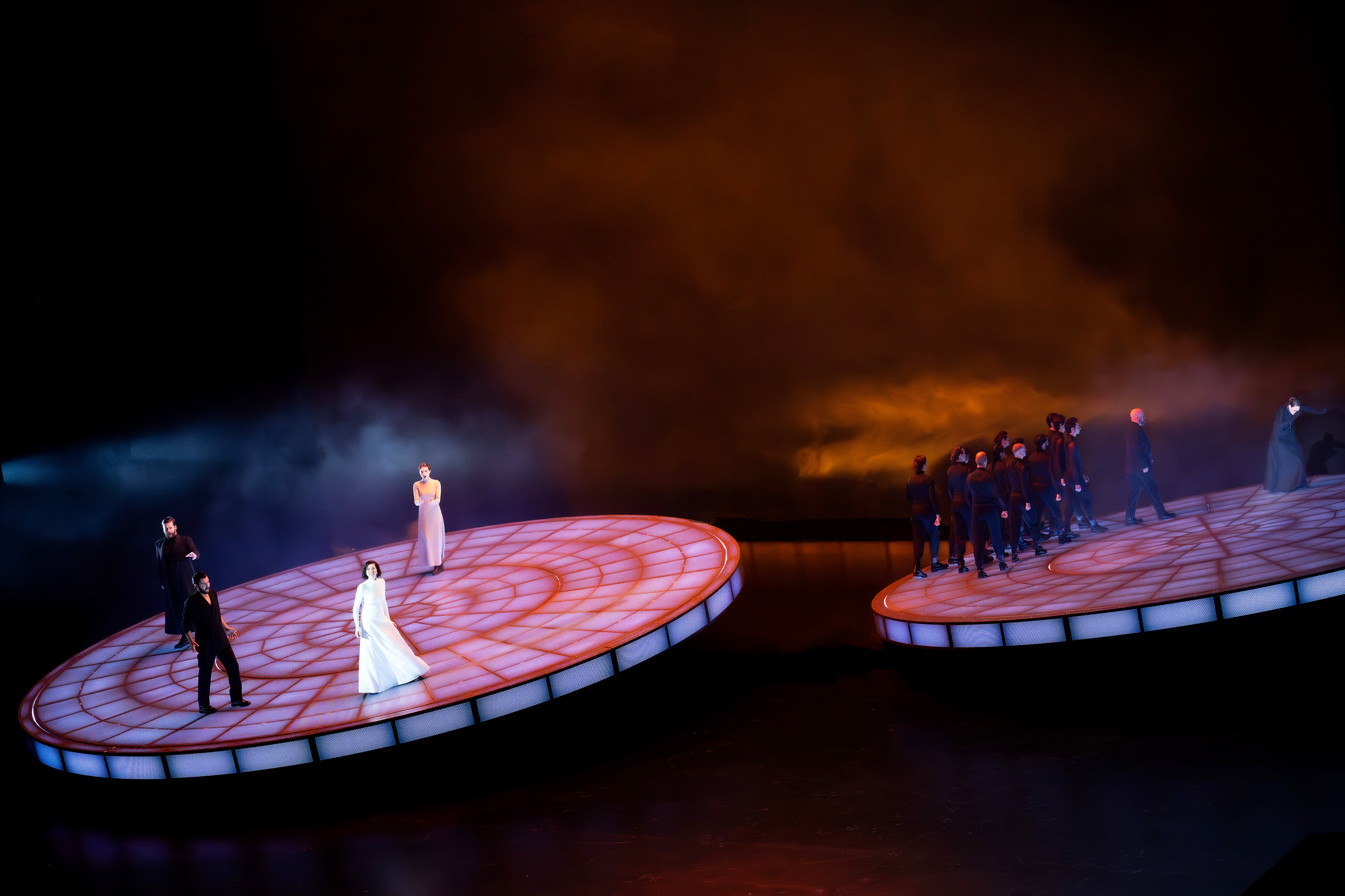 Il regista tedesco costruisce un imponente apparato con due pedane circolari rotanti sempre in movimento. Queste pedane girano a diverse altezze sul grande palcoscenico del Festspielhaus ruotando su un perno centrale, si inclinano in tutte le direzioni e nel contempo ruotano su loro stesse, costringendo i cantanti ad un lento ma perenne movimento. I due dischi rotanti sono poi sovrastati da un terzo immenso disco luminoso, che crea molteplici situazioni sceniche e che viene anche utilizzato per le proiezioni.