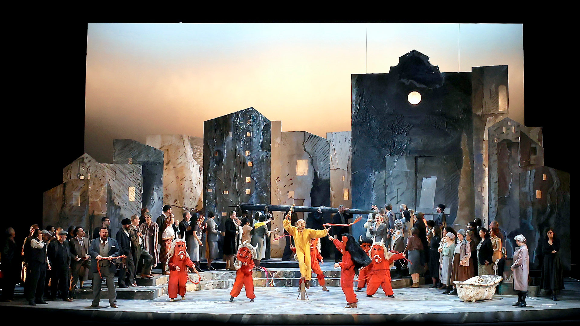 L’allestimento è in coproduzione con la Fondazione Teatro del Maggio Musicale Fiorentino, la regia è curata da Luigi Di Giangi e Ugo Giacomazzi, il duo dei “Teatrialchemici”. Carina la scenografia: una piazza, con due scalini che conducono nei pressi delle case sullo sfondo, a destra vi è la chiesa con la sua porta d’ingresso. E poi vi sono le maschere, indossate dai bambini, alcune dai tratti terrificanti.