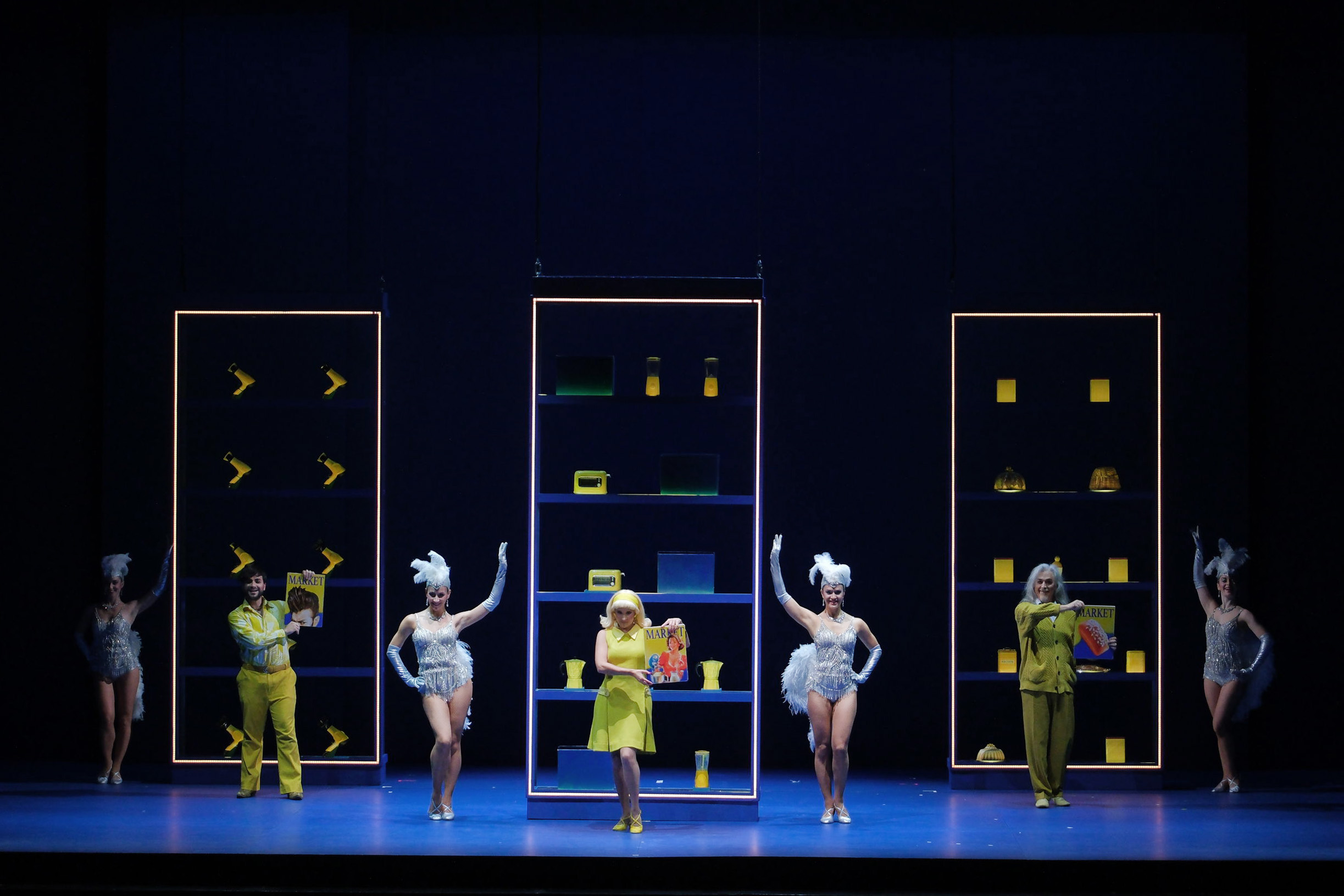 Regia simpatica e divertente quella di Roberto Catalano, che ambienta la vicenda, di per sé già evanescente, in una non meglio precisata modernità, in cui il consumismo sfrenato la fa da padrone, tanto che tutti i personaggi, ma in particolare la volitiva Fiorilla, sono presi dalla smania del possesso di beni materiali che si declinano in elettrodomestici di ogni tipo, profumi e consimili. Per Catalano e per Guido Buganza, autore di scene semplici con ampio utilizzo di luci a vista, il consumismo ha il colore del giallo: gialli tutti gli oggetti, gialli la maggior parte dei costumi, gialli gli accessori. I costumi vanno di conseguenza. Il colpo d’occhio è sempre piacevole, richiama gli anni cinquanta del novecento e strizza l’occhio alle pin up. Iconica la caffettiera gialla, che ritorna costantemente durante lo spettacolo. Chissà cosa mai vorrà significare?