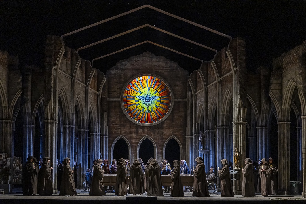 Di fronte a questa sfida Visser sceglie l’attualizzazione, ambientando la vicenda ai giorni nostri nell’abbazia diroccata di San Parsifal -scene di Frank Philip Schlöß- ispirata all’abbazia di San Galgano, che dista una manciata di chilometri da quel Duomo di Siena che per Wagner era la perfetta raffigurazione della Sala dei cavalieri del Graal. Le rovine adesso sono diventate un’attrazione turistica ma anche luogo di pellegrinaggio, in cui si incontrano infermi accuditi da suore infermiere, giovani ambientalisti che ambiscono ad un mondo meno inquinato e Kundry, prostituta alla ricerca di tranquillità e pace interiore. Motore della vicenda è un ragazzino in gita, il bravissimo Leander Wilde, sempre in scena per tutta la durata dello spettacolo, che, ispirandosi ad un libro che ne narra le vicende, diventa una sorta di doppio di Parsifal, che infatti entrerà in scena vestito come lui -costumi di Jon Morell- e lo accompagna nel suo percorso di salvezza dell’umanità. I cavalieri del Graal sono dei monaci che ancora vivono all’abbazia, probabilmente dimentichi del loro voto di mansuetudine dato che se non fosse per l’intervento di alcuni agenti in tenuta anti sommossa aggredirebbero Parsifal reo di avere ucciso il cigno, mentre la scena della rievocazione dell’ultima cena è sostanzialmente una messa con tanto di eucarestia distribuita a tutti i presenti, preceduta da una serie di video di guerra e inquinamento durante il cambio di scena.