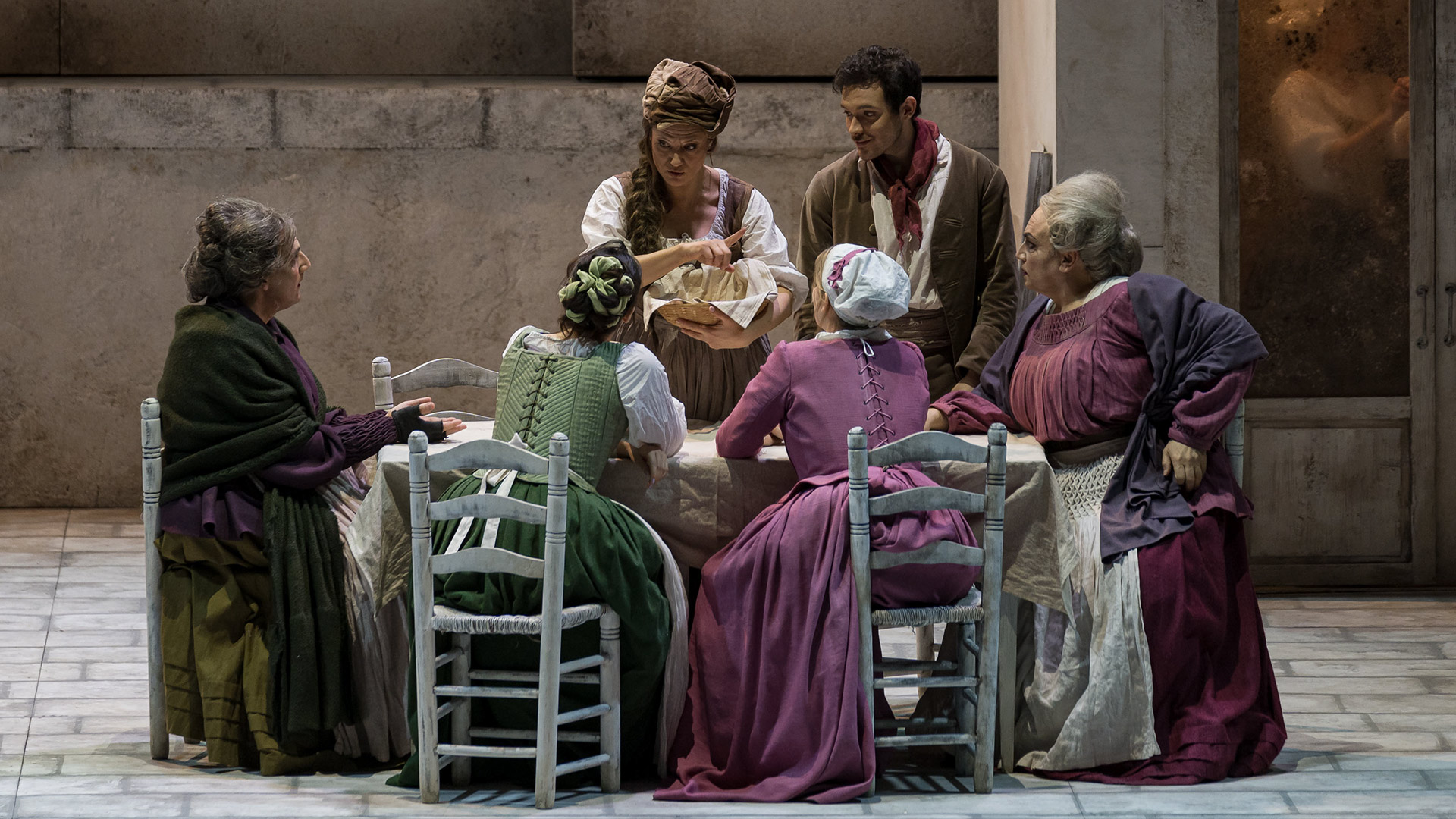 Si entra in sala e il sipario è aperto, verrà chiuso solo alla fine dell’opera: questa scelta registica dà subito il senso di piazza e ci porta immediatamente nell’ambiente veneziano: con i mimi che si aggirano oltre il palcoscenico ci si trova noi stessi nel Campiello, in mezzo alle baruffe e ai maneggi per maritar le figlie.