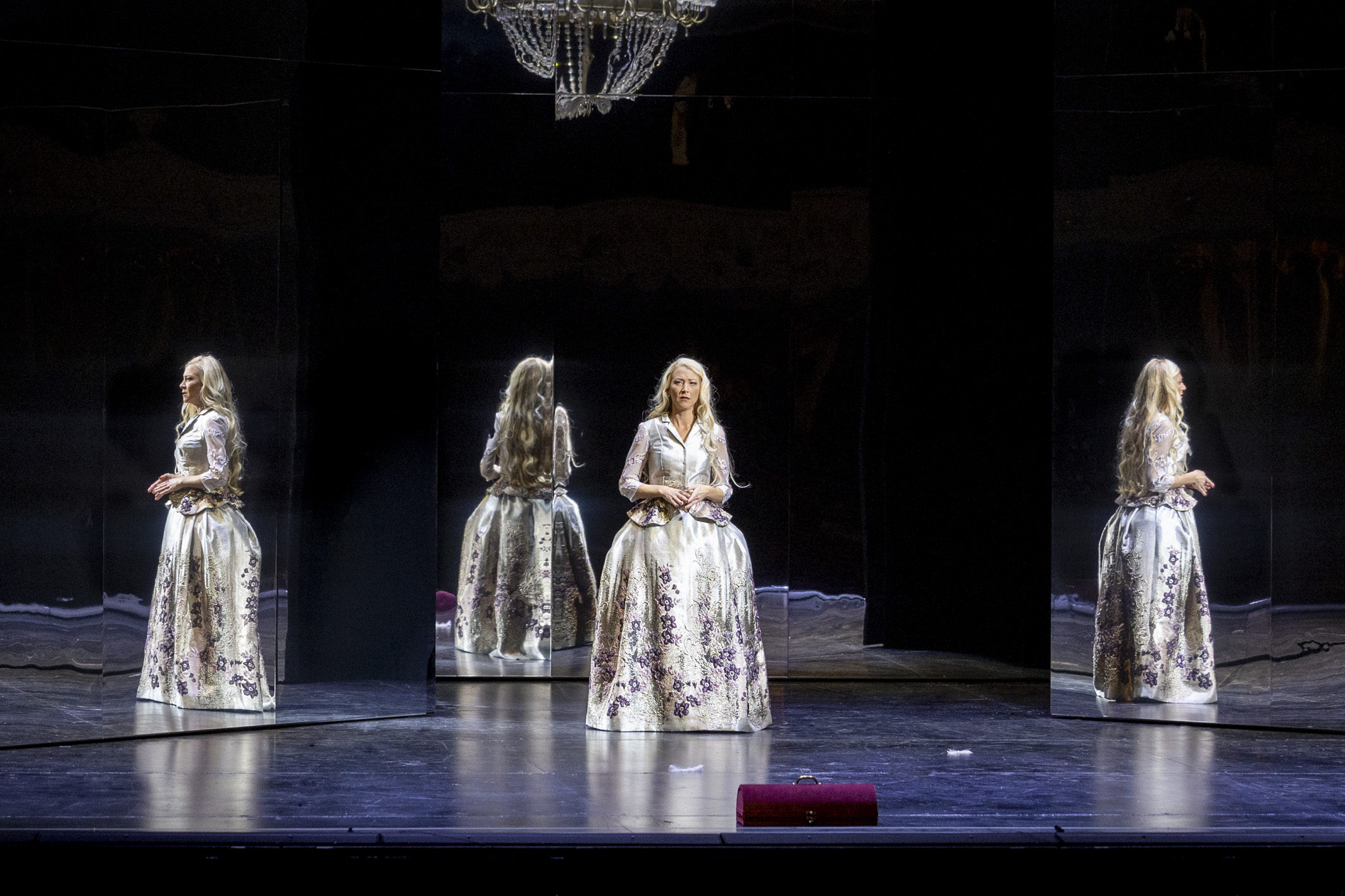 Lo spettacolo esalta giustamente il ruolo preminente della Marescialla, iniziando e concludendosi in una stanza che è tutta uno specchio e in cui la protagonista riflette sul tempo che passa proprio riflettendosi nell’inesorabilità della sua immagine rimandata dagli specchi. Idea non sommamente originale, ma ben gestita, con quinte mobili che ampliano e restringono l’ambiente a seconda delle necessità. Molto bello poi l’inizio del terzo atto: con un palcoscenico vuoto da cui avanza una piccola stanza dai tratti infantili, il separè di Ochs e Mariandel, circondata nel vuoto da nere sculture di animali esotici glitterati. Un bel colpo d’occhio. Meno a fuoco sia come idea, un banale telo con dipinto un ambiente settecentesco, che come realizzazione il secondo atto. I costumi richiamano un settecento stilizzato e modernizzato, per poi spostarsi al tempo della composizione dell’opera nel terzo atto.