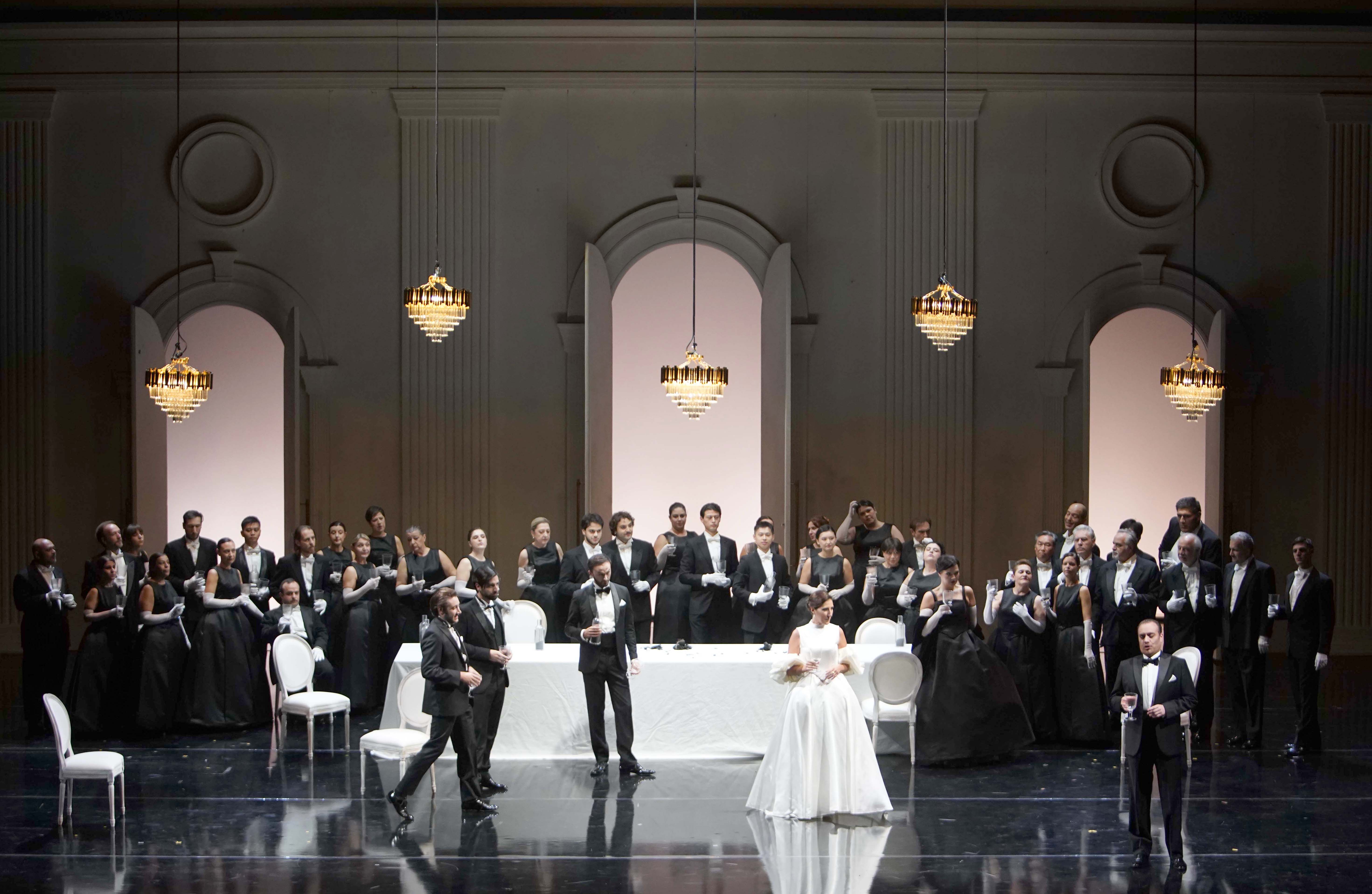 Roberto Catalano riesce a creare l’atmosfera delle tre opere con una scenografia comune, che però è molto efficace e consona a ciascuna di esse. Sempre molto precise le indicazioni sui movimenti scenici degli artisti, per cui l’opera scorre fluida e senza cose stravaganti. Le scene sono di Mariana Moreira e i costumi di Veronica Pattuelli. Entrambe sono riuscite a rendere il tempo dell’opera come Verdi l’aveva concepita, con abiti eleganti ed anche attuali. Le luci di Silvia Vacca sono giocate sul bianco e il nero-grigio, toni freddi com’è arido e freddo a volte il cuore dell’uomo, che considera la donna, vedi l’inizio di Traviata, come un oggetto di piacere e basta. Solo i lampadari durante le due feste sfoggiano una luce gialla intensa che illumina la scena, ad indicare come il piacere colora l’esistenza.