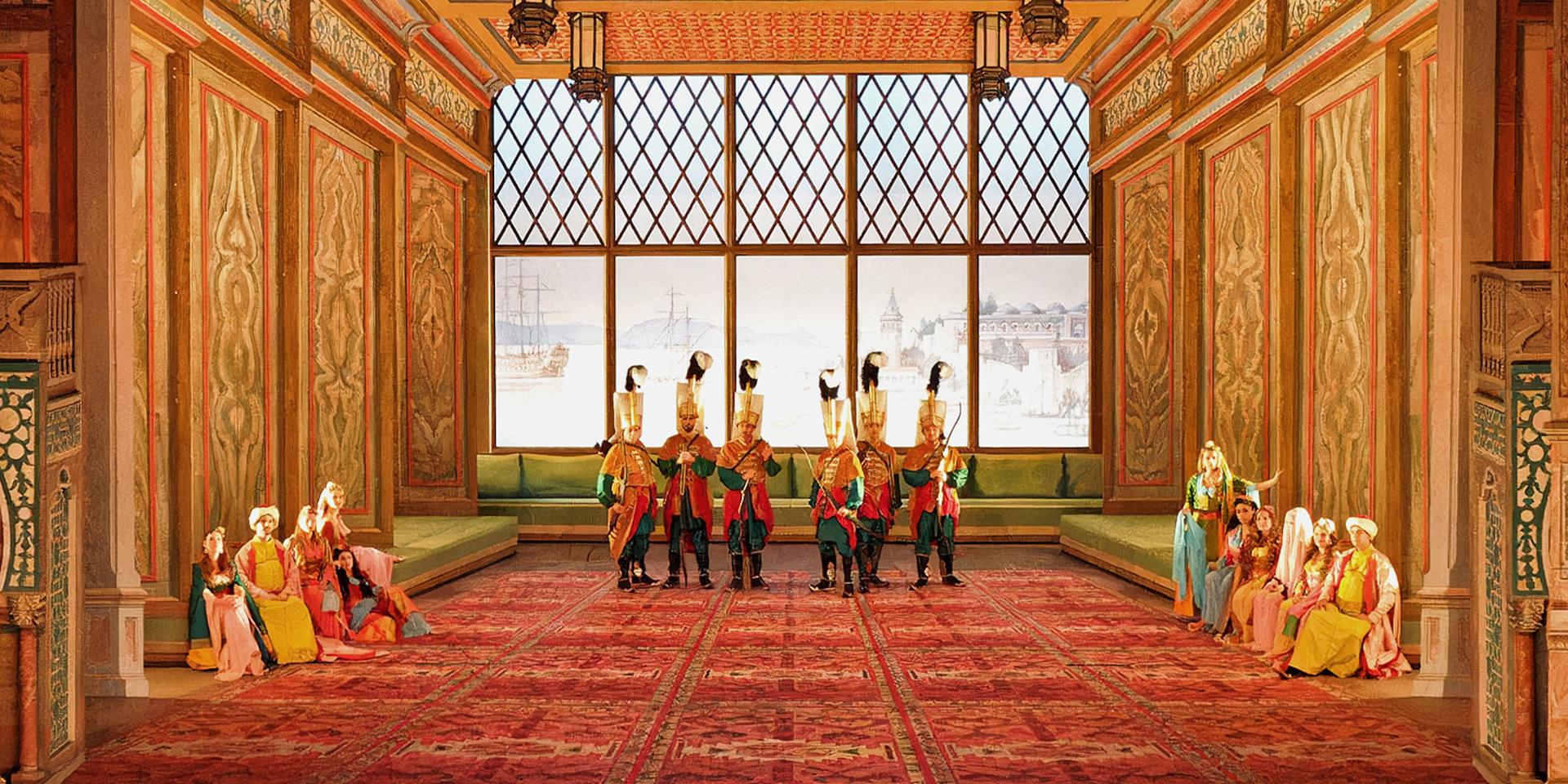L’impianto scenico ricco e ricercato interpreta i canoni settecenteschi della turcheria, dove tutto è possibile e dove tutto è il contrario di tutto. L’impianto scenico è fiabesco, da novelle orientali; i colori rifulgono e si scambiano dalle quinte del palazzo con quelli sui costumi: i blu, i carmini, i verdi, gli arancio, i fucsia, i gialli! Lasciano le pareti e si posano sui corpi dei protagonisti e dei Giannizzeri. Pareti modulabili che si allargano e si restringono là dove la recitazione richiama lo straniamento e la prigione; colonne variopinte che proiettano ombre animate di vita propria, che mute recitano a fianco dei protagonisti. Ricchissimi i dettagli scenici: i tappeti orientali, gli intarsi marmorei, il minareto al di là del prospettico patio.