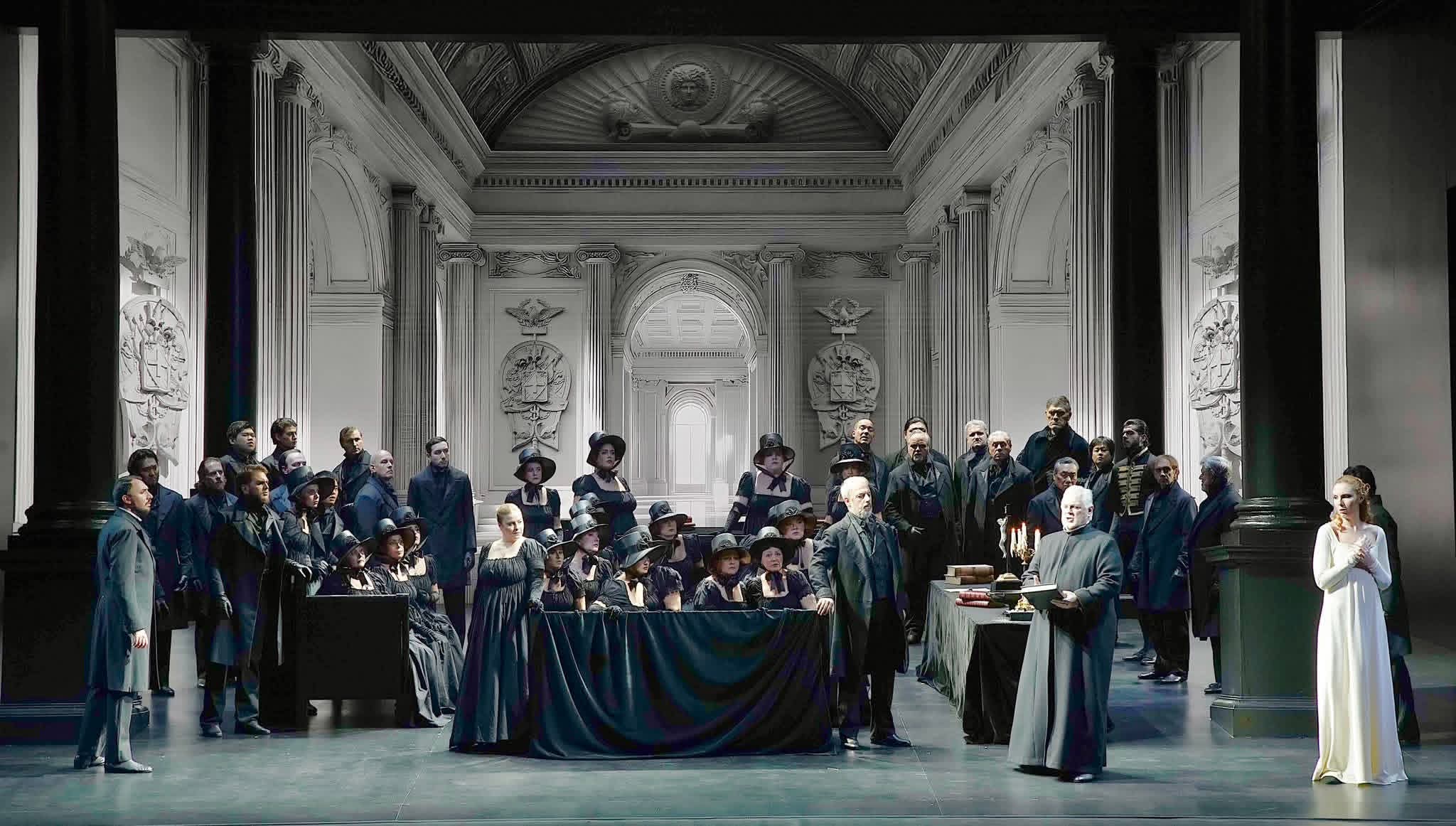 La prima scena è dominata da un forte nero, che caratterizza bene anche gli ottimi vestiti del coro e di alcuni protagonisti. Poi prevale un bianco candido, con vari editing video realizzati da Matteo Letizi, dove vengono valorizzate le profondità, le architetture di taglio neoclassico, i chiaroscuri, i raggi di luce quasi caravaggeschi curati da Massimo Gasparon, che è anche regista collaboratore. C'è un senso di asciuttezza, di essenzialità, con pochi elementi che mettono in risalto il significato profondo e religioso dell'opera.