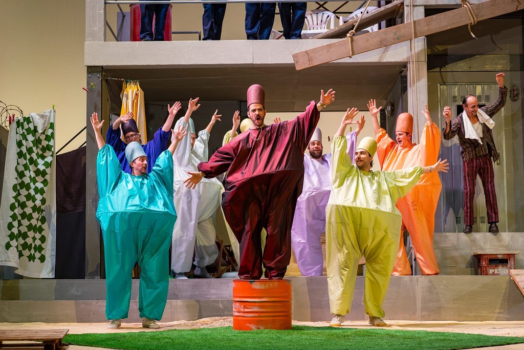 In questo rigore trova spazio la visione registica di Fabio Cherstich (ben coadiuvata dalle scene di Nicolas Bovey e dalle luci di Alessandro Pasqualini), che declina il Palazzo di Mustafà in un cantiere adagiato in un deserto non precisato. Sotto un sole a picco, tra gigantesche palme gonfiabili e un trionfo di cemento e di calce in sacchi, i ponteggi e i gabinetti rimediati alla meglio dicono la provvisorietà, diventata nel frattempo casa, di un mondo abitato da uomini — manovali (il puntualissimo coro Merulo di Reggio Emilia) e strabilianti mimi-acrobati dalle maniere ruvide e chiassose — dove la femmina è chimera e sogno proibito e la complicità virile è strategia di sopravvivenza. Il Mustafà di Giorgio Caoduro è smagliante: un macho latino stanco della moglie Elvira (la brava Gloria Tronel), intrappolato nella propria corazza egocentrica, bisognoso di conferme, gaffeur seriale quanto inconsapevole. Gli fa eco il Lindoro di Antonino Siragusa, arrivato in corsa a sostituire un indisposto Ruzil Gatin, capace di un fraseggiare naturalissimo e di acuti svettanti che si pongono come perfetto contraltare allo scultoreo cesello del baritono. Ma è il Taddeo di Marco Filippo Romano a risultare irresistibile: vocalmente imperioso e scenicamente maldestro, trasforma il calzettone bianco nel sandalo aperto in un dettaglio di micidiale aderenza alla parola. La sua voce è marmo levigatissimo, lo scandire della pulsazione rossiniana è un manuale di canto. In questa cornice, la Isabella senza sbavature di Laura Verrecchia si muove come un’aliena. Stratega audace e cinica, amministra, sostenuta da una vocalità di assoluto pregio, il potere del corpo attraverso quello della mente, orchestrando i destini altrui senza sparare un colpo e piegandoli al suo progetto. In buca, con Cadario che "surfa" le onde di una girandola di equivoci, l’orchestra ne sottolinea ogni mossa, sorniona e guascona; sta con la schiava approdata a riva a seguito del naufragio del suo vascello, ma non può evitare di provare simpatia per il mal assortito trio di uomini che, a terra, se ne contendono i favori. Straordinaria la gag di Mustafà, surriscaldato da amorose vampate e placato dal ventilatore puntato sulle parti intime, con il prezioso il clavicembalo che profuma d’altrove mimando passi mozartiani, a cui farà eco la trina riconciliante dei clarinetti, velluto puro, in apertura di secondo atto. Poi, come da copione, per un istante tutto si congela. I personaggi iniziano a balbettare prima di sciogliersi nella follia "organizzata e completa" di stendhaliana memoria.