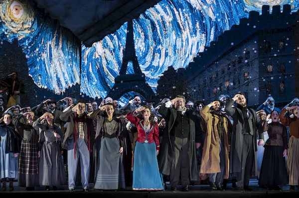 All’apertura del sipario, nel primo quadro, ci siamo visti catapultare in un affascinante Parigi bohemienne, con una scenografia (a cura di Davide Livermore) particolarmente suggestiva per la soffitta dove vivono i protagonisti della vicenda. Una scena fortemente prospettica mostra l’interno dell’appartamento, con mobilia essenziale in stile ottocentesco, un soffitto a cassettoni di foggia barocca, una parete scura sulla destra ed una parete chiara sulla sinistra, coperta con una serie di schermi giganti a rappresentare dei quadri. I quadri sono cangianti e contribuiscono, assieme alle luci, curate sempre da Livermore, a creare l’atmosfera sentimentale del primo quadro, in modo molto pittorico. La sensazione è quella di trovarsi di fronte ad una illustrazione presa da un libro, forse un rimando al testo di Murger. Nel secondo quadro, l’atmosfera natalizia di Parigi davanti al Caffè Mamus è ben rappresentata da una allegra confusione tra figuranti, passanti, coristi e i tavolini ai quali si accomodano i protagonisti. Una confusione a tratti quasi caotica. Qui le scene sono più aperte rispetto a prima e la parete di schermi a sinistra mostra l’insegna del bar. Allegra confusione, quando, a seguito degli interventi di Parpignol, entrano anche i bambini. Molto suggestiva è la scenografia del terzo quadro, davvero ben riuscita. Gli schermi si posizionano a sinistra e dietro la scena, cambiando colore per suggerire l’andamento delle stagioni. Da un iniziale algido e pallido inverno ad una calda primavera che si rischiara di colori più intensi, in una rappresentazione pittorica che richiama un po’ l’arte giapponese. Il quarto quadro ci riporta nella soffitta dell’inizio, ma con un'atmosfera meno familiare, più fredda e più cupa, a mano a mano che Mimì si avvicina alla sua ora fatale. Qui certamente il lavoro sulle luci di scena ha fatto la gran parte del lavoro, molto apprezzato. I costumi sono allineati con l’epoca (la seconda metà dell’800) e conferiscono un colore caratteristico perfettamente integrato con le scenografie.