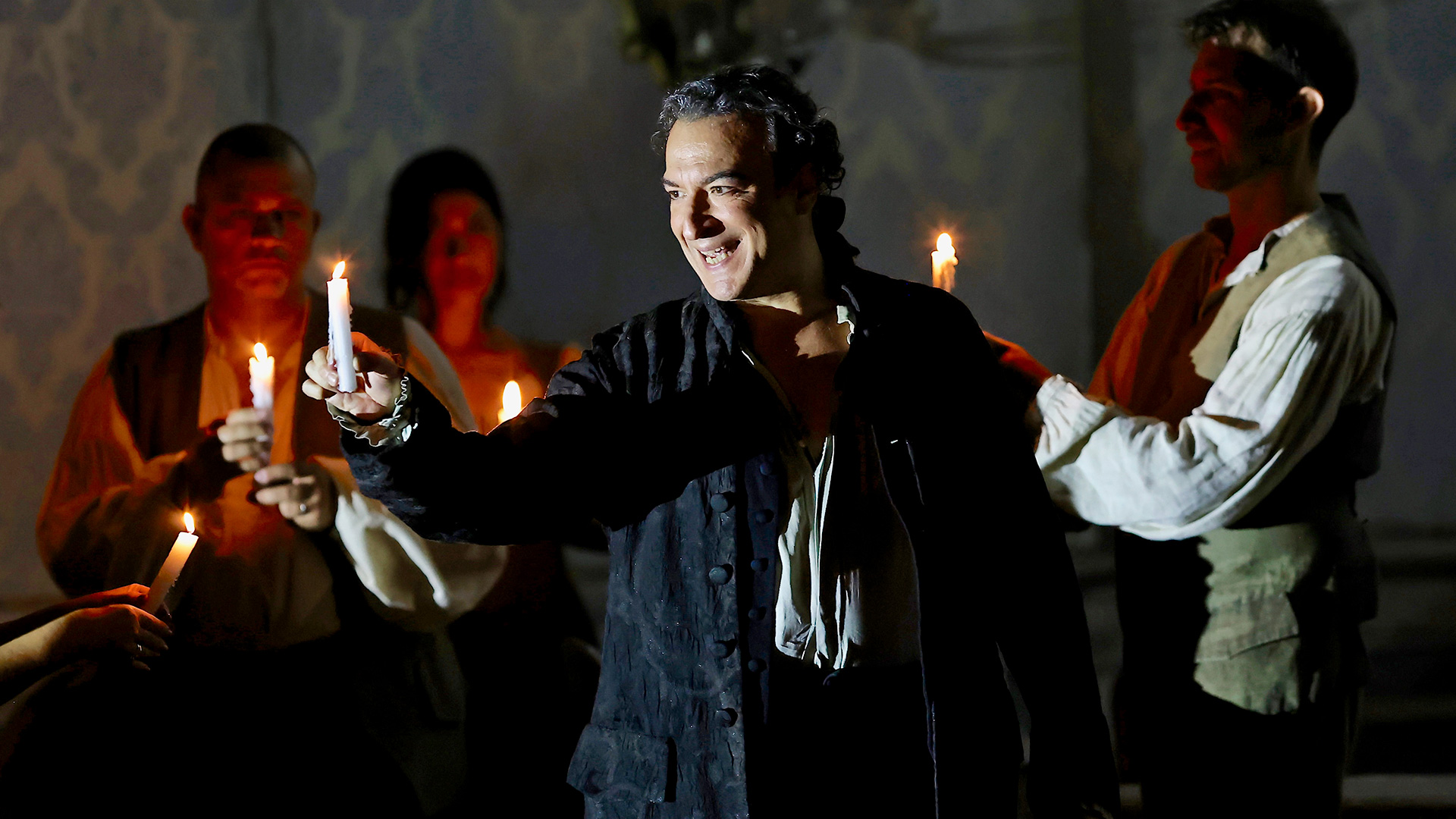 Molto efficaci i giochi di luce di Fabio Barettin, coadiuvato da Ludovico Gobbi, con l’utilizzo di candele vere accese e spente alle pareti. Oppure con ombre proiettate, lunghissima e altissima quella di Don Giovanni. Le scene sono poco illuminate a sottolineare la decadenza della casa e dei personaggi.